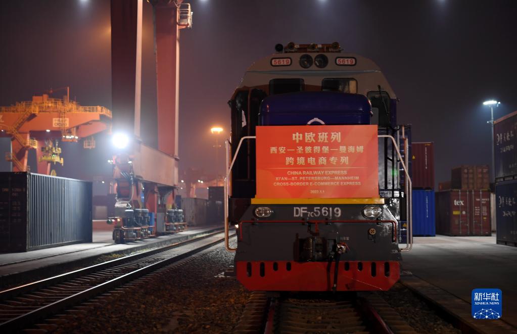 2021年12月31日晚,中欧班列长安号跨境电商专列在西安国际港站准备出发开往德国曼海姆