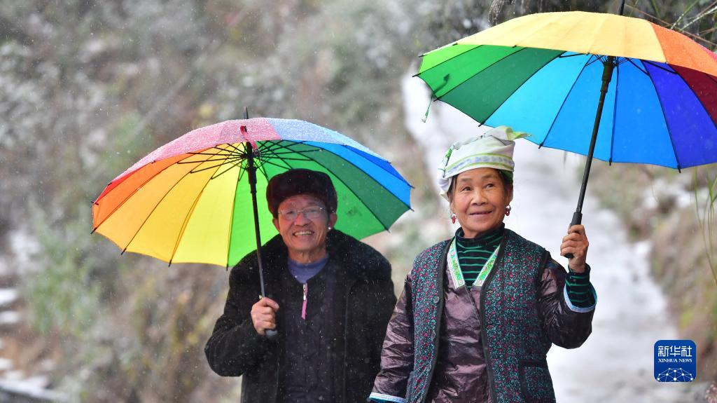 在乌英苗寨,村民梁安合和妻子梁英迷在赏雪(2021年12月26日摄)。乌英苗寨位于桂黔交界的大苗山深处,曾经是一个极度贫困的苗寨。2020年,乌英苗寨实现整体脱贫