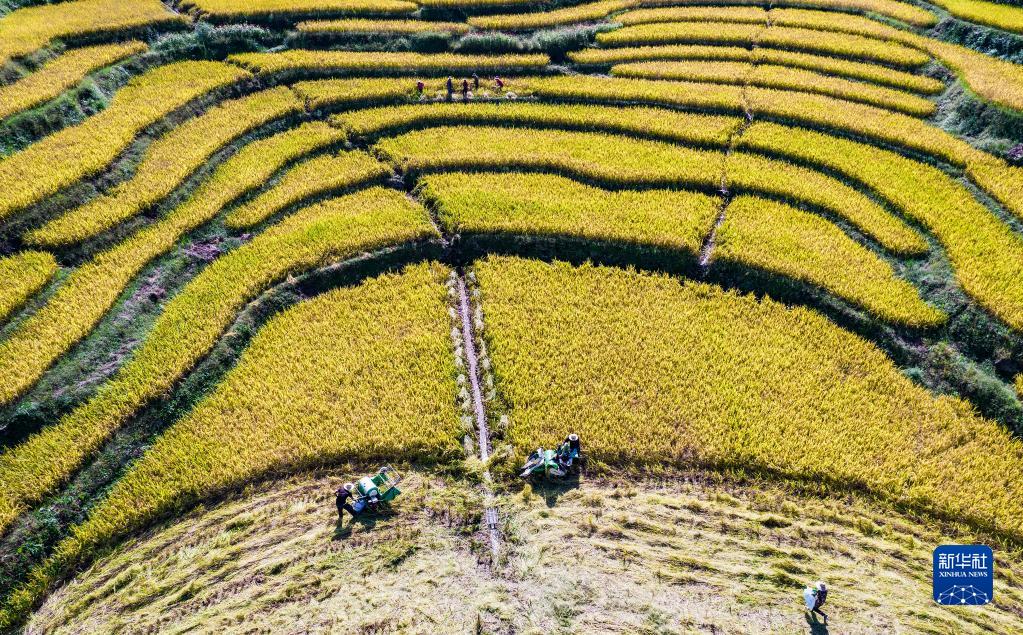 2021年9月21日,湖北省秭归县沙镇溪镇村民在田间收获高山冷水稻(无人机照片)