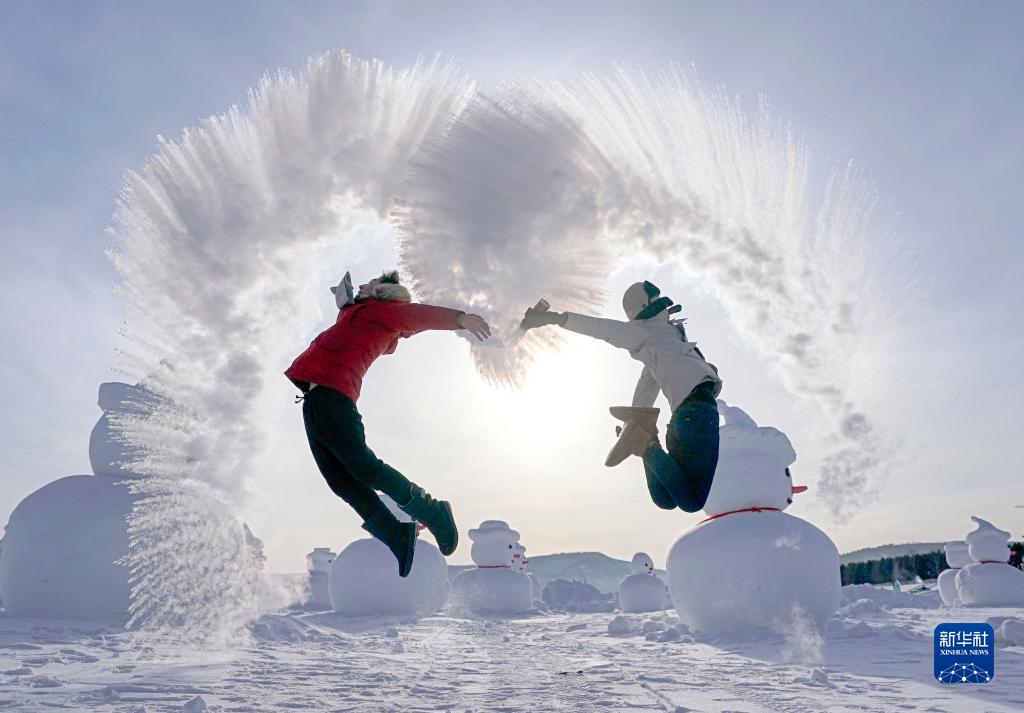 2019年1月24日,在黑龙江省漠河市北极村,游客体验“泼水成冰”游戏