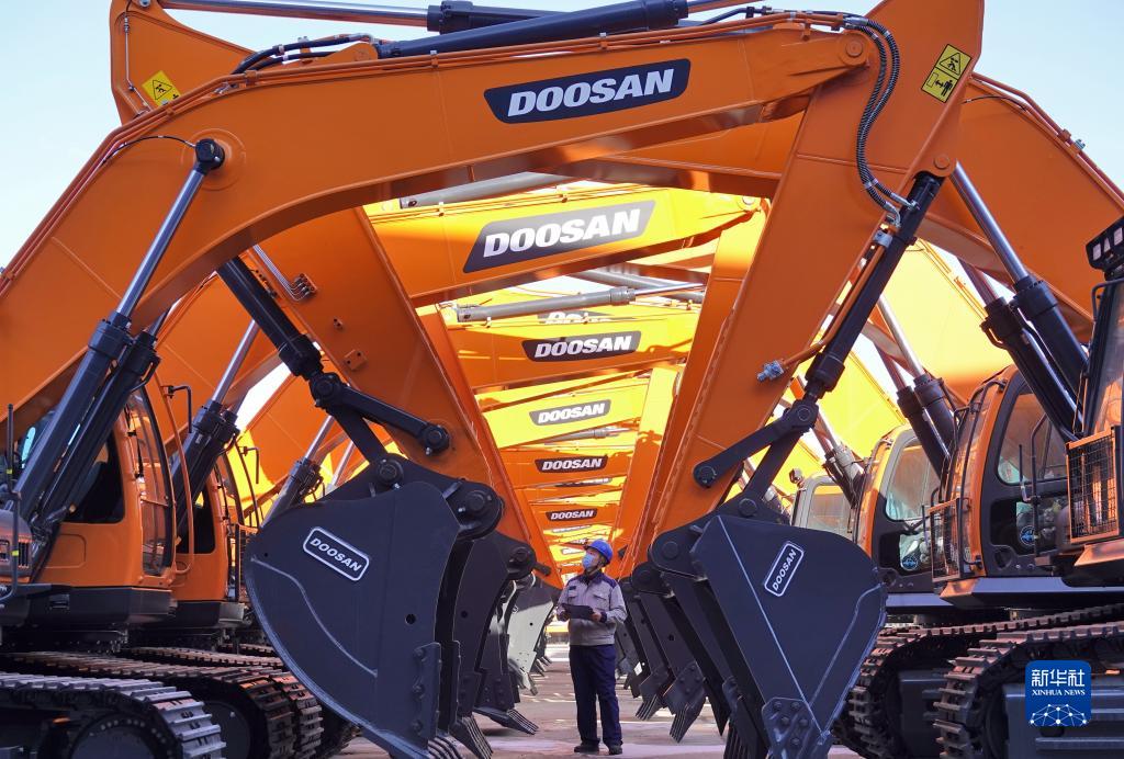 1月17日,在山东烟台开发区一家工程机械有限公司,工作人员对出厂机械设备进行检查