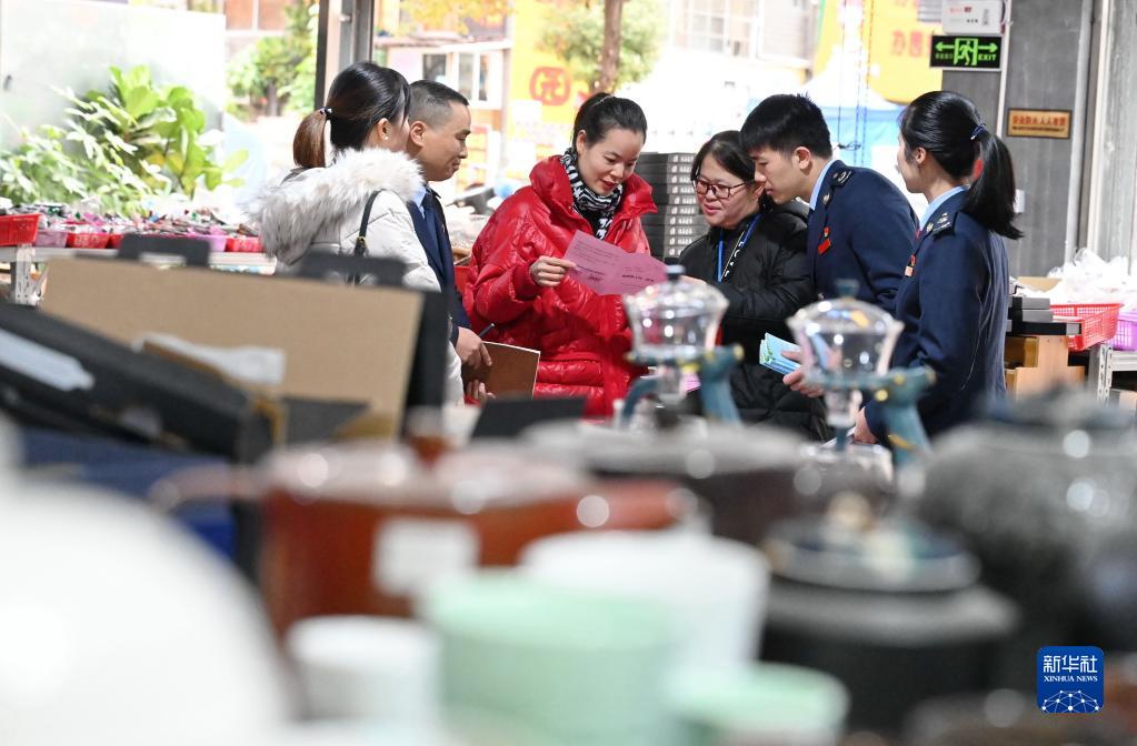 2020年12月17日,在福建省德化县,税务工作人员向一家电商企业负责人(左三)宣传介绍疫情防控期间小微企业的税收优惠政策