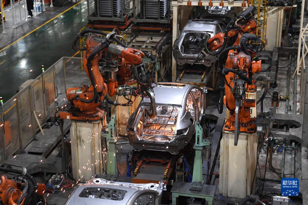 工业机器人在江淮汽车乘用车焊接车间生产线上工作(2月22日摄)