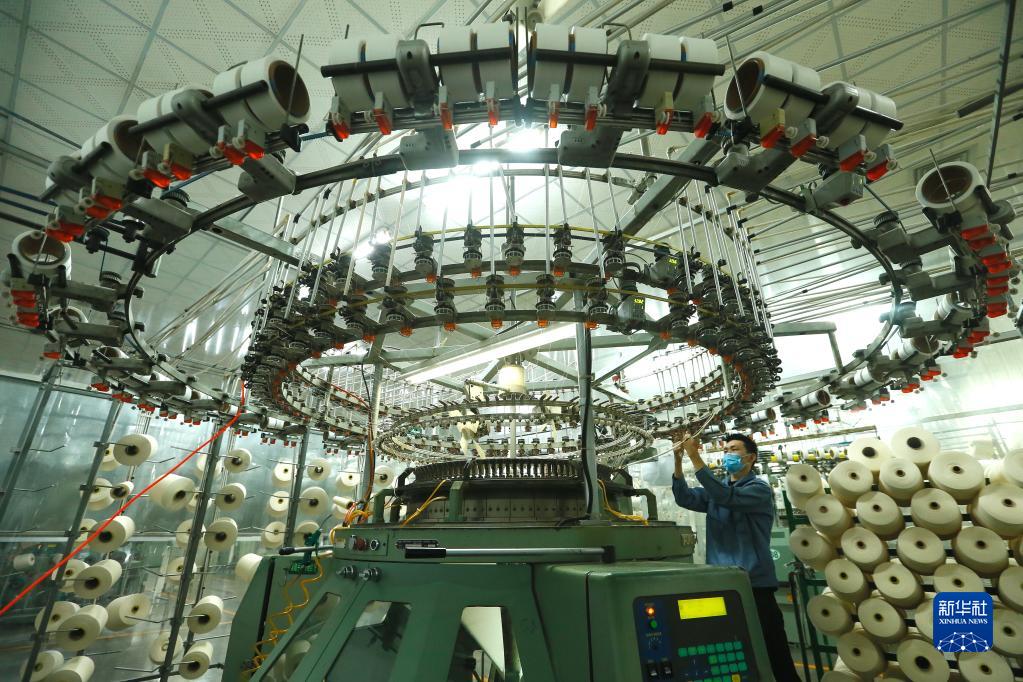 江苏省泰州市海陵区一家公司的纺织工人在生产一线作业(2月7日摄)