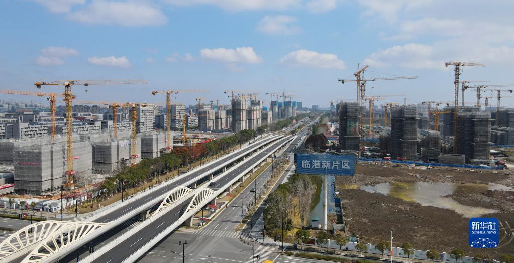 2月10日在中国(上海)自由贸易试验区临港新片区拍摄的住宅区建设现场(无人机照片)