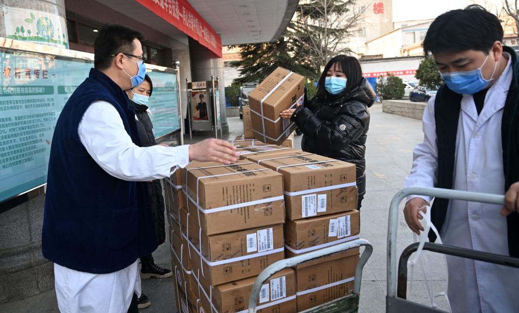 2月7日,北京丰台医院的医护人员搬运“宣肺败毒颗粒”。