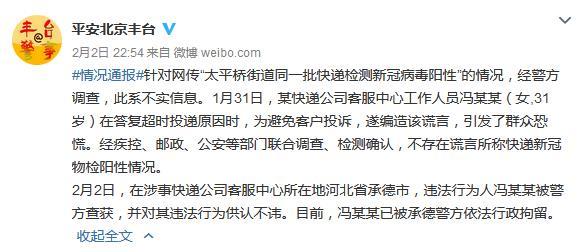 据北京丰台公安分局官方微博消息,针对网上流传“太平桥街道同一批快递检测新冠病毒阳性”的情况,经警方调查,此系不实信息。经疾控、邮政、公安等部门联合调查、检测确认,不存在谎言所称快递新冠物检阳性情况。
