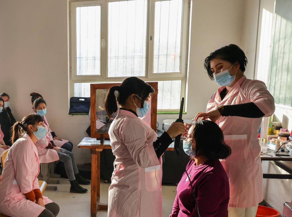 2021年12月13日,在新疆莎车县城北街道,居民参加美容美发技能培训。冬闲时节,莎车县开展“科技之冬”培训活动,帮助当地居民提高职业技能水平。新华社记者 丁磊 摄