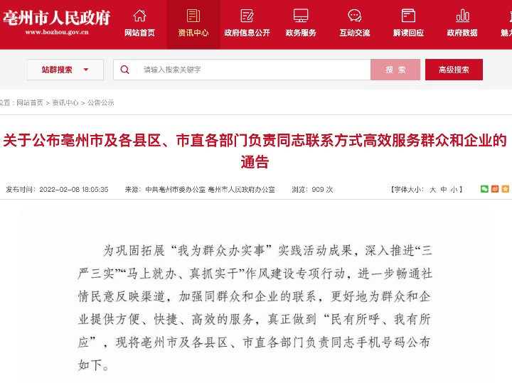 2月8日,亳州市人民政府官网发布《关于公布亳州市及各县区、市直各部门负责同志联系方式高效服务群众和企业的通告》