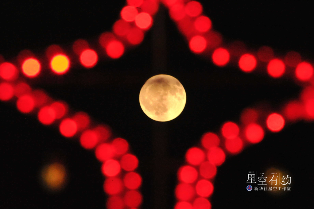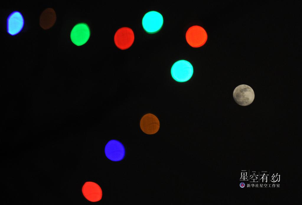 这是2013年2月24日元宵节,北京夜空的月亮与五彩缤纷的灯饰相映成辉。这一年的元宵月是“十七圆”
