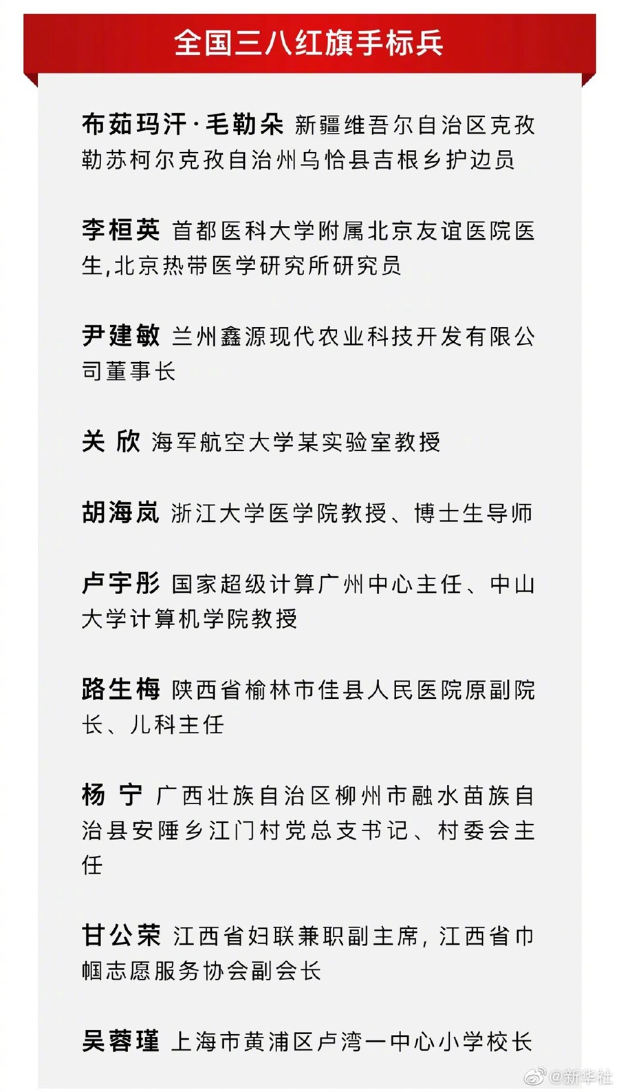 记者3日从全国妇联获悉,全国妇联日前决定授予布茹玛汗·毛勒朵等10人全国三八红旗手标兵荣誉称号。名单见下图。